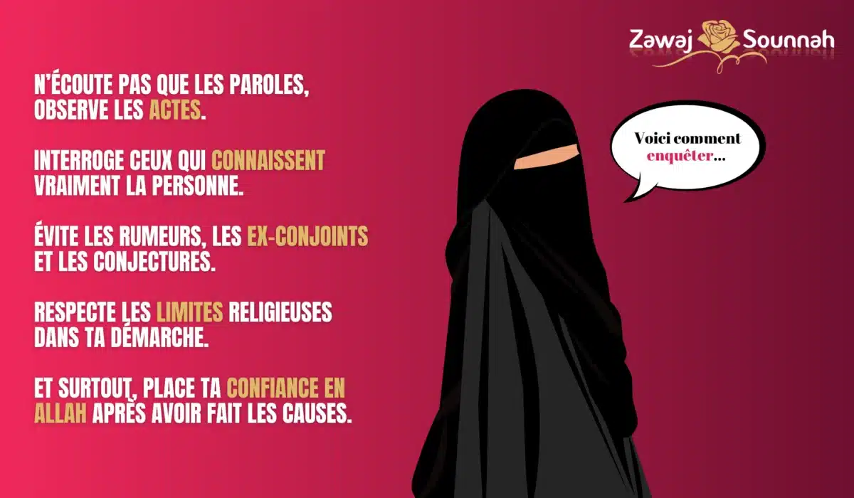 Enquêter est une cause essentielle à la réussite de ton mariage. Mais Celui qui protège et garantira sa réelle réussite c’est Allah سبحانه و تعالى. Fais ton possible avec sincérité, puis abandonne-toi à Sa sagesse. Observe, analyse, questionne et invoque Le Créateur des Cieux et de la Terre سبحانه و تعالى . C’est Lui qui dévoile les secrets, qui éclaire les cœurs, qui protège de la tromperie. Le Prophète صلى الله عليه وسلم a dit : « Ne repousse le destin que l’invocation » (Al-Hakim, authentifié par al-Albani).
