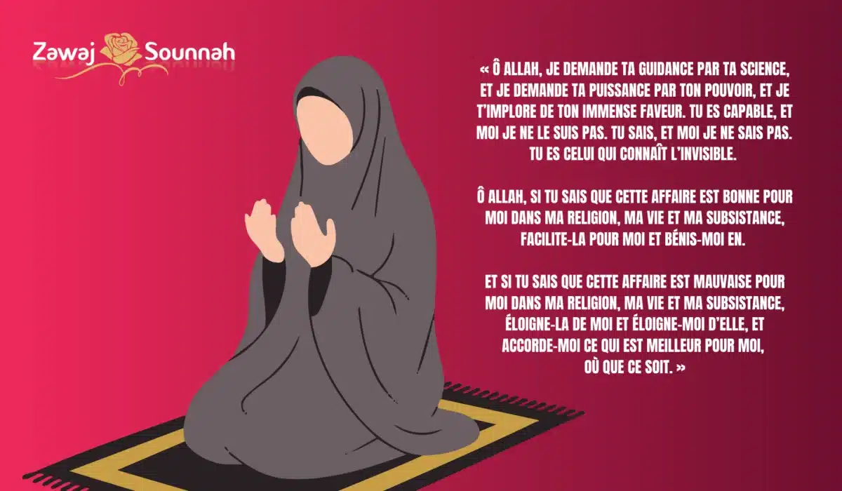 Tu es Celui qui connaît l’invisible. Ô Allah, si Tu sais que cette affaire est bonne pour moi dans ma religion, ma vie et ma subsistance, facilite-la pour moi et bénis-moi en. Et si Tu sais que cette affaire est mauvaise pour moi dans ma religion, ma vie et ma subsistance, éloigne-la de moi et éloigne-moi d’elle, et accorde-moi ce qui est meilleur pour moi, où que ce soit. »